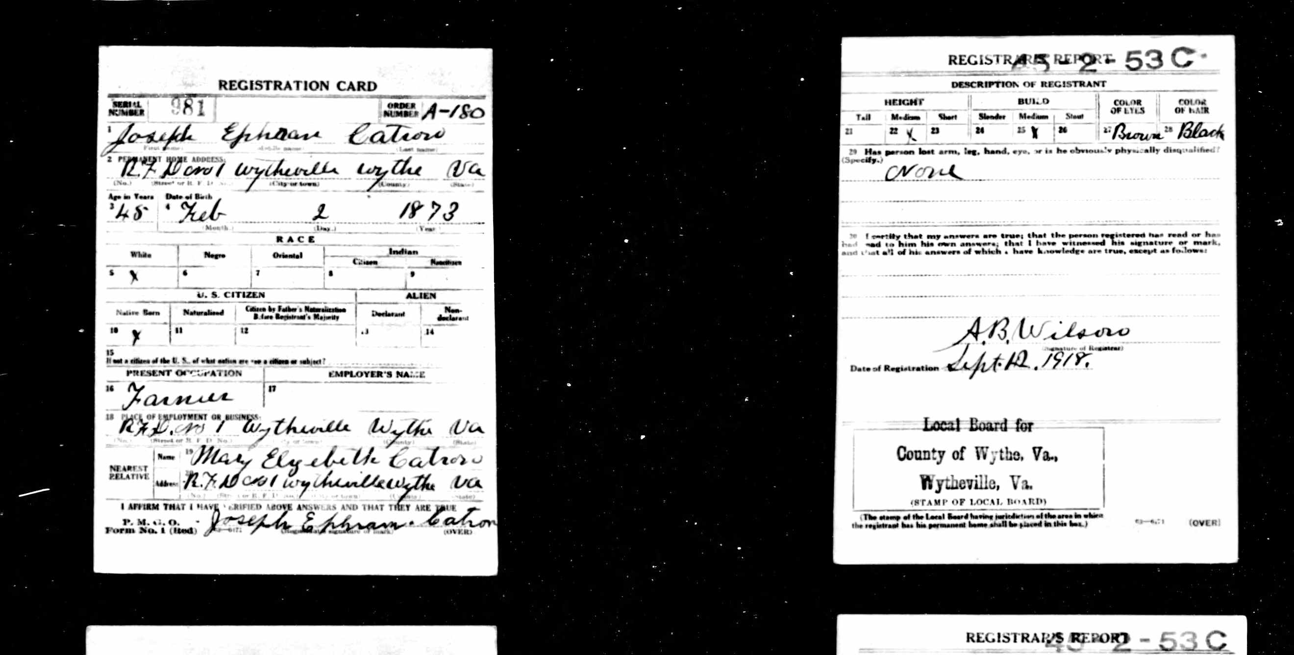 Joseph Ephraim Catron - U.S., World War I Draft Registration Cards, 1917-1918