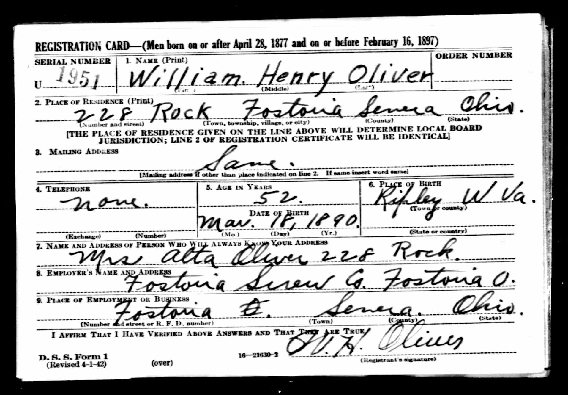 | William Henry Oliver - U.S. World War II Draft Registration Cards, 1942 |