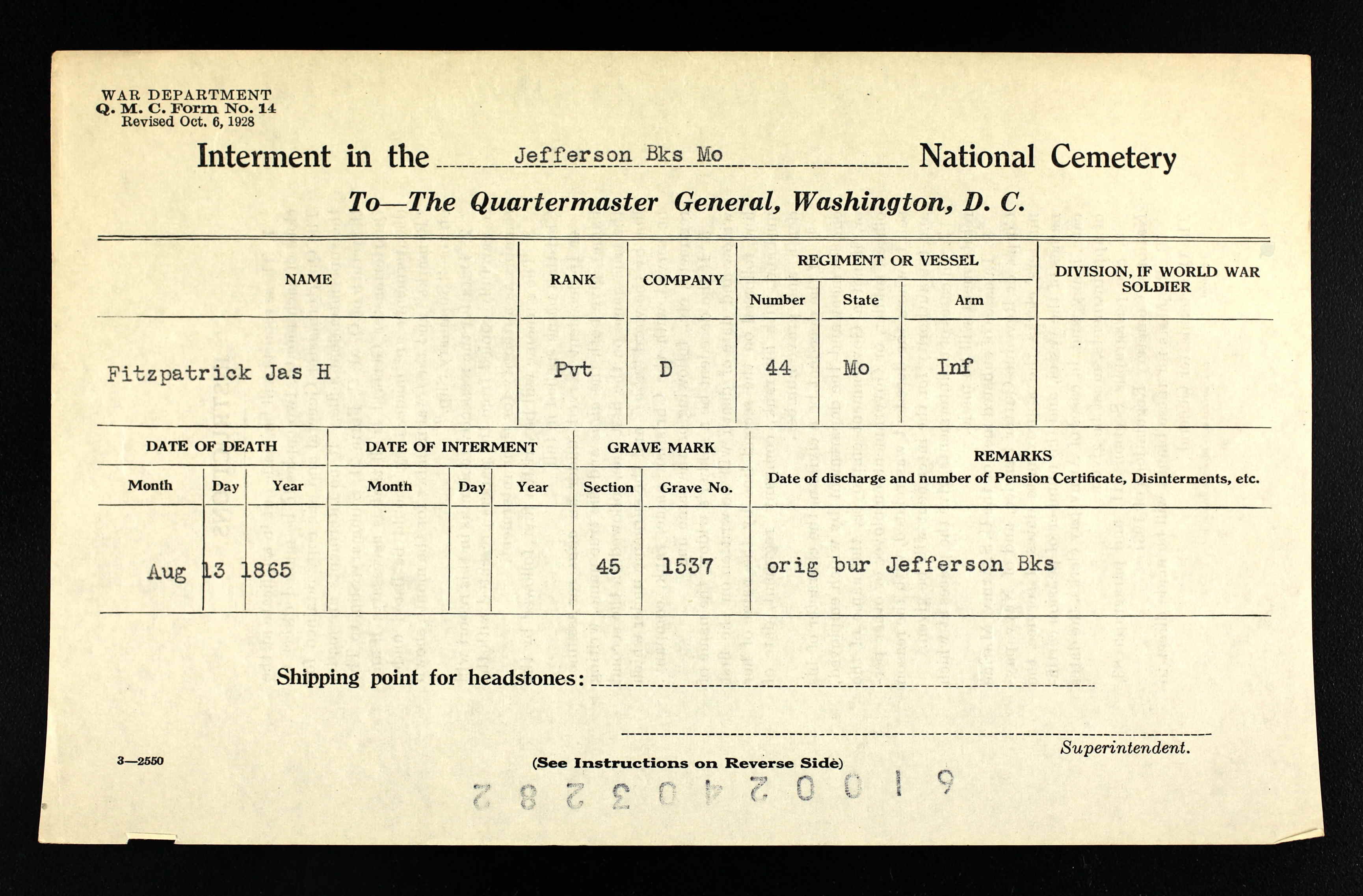 | James H Fitzpatrick - U.S. National Cemetery Interment Control Forms, 1928-1962 |